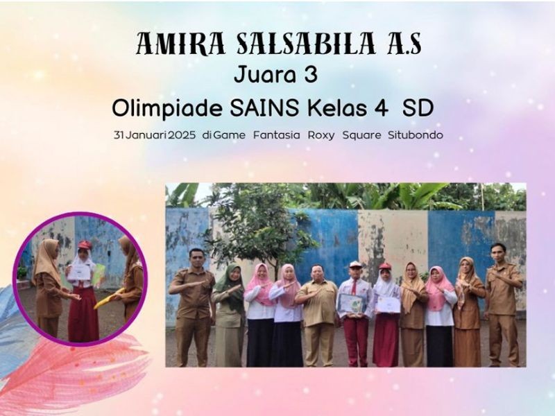 Situbondo, 3 Februari 2025 – Prestasi membanggakan kembali diraih oleh salah satu siswa berbakat. Amira Salsabila A.F berhasil meraih juara 3 dalam Lomba Sains tingkat SD yang diselenggarakan di Roxy Situbondo pada 31 Januari 2025. Keberhasilan ini menjadi bukti kerja keras dan semangat belajar Amira dalam bidang sains. Dengan persiapan yang matang dan dukungan dari guru serta keluarga, Amira mampu bersaing dengan peserta lain dari berbagai sekolah dasar di Situbondo. Sebagai bentuk apresiasi, Senin (3/2) selepas upacara bendera, Amira berfoto bersama guru dan teman-teman sekelasnya. Suasana penuh kebanggaan dan kebahagiaan tampak dalam sesi foto tersebut, menunjukkan dukungan sekolah terhadap prestasi para siswanya. Semoga pencapaian ini menjadi motivasi bagi siswa lainnya untuk terus berprestasi dan mengharumkan nama sekolah di berbagai ajang kompetisi akademik. Selamat untuk Amira Salsabila A.F.