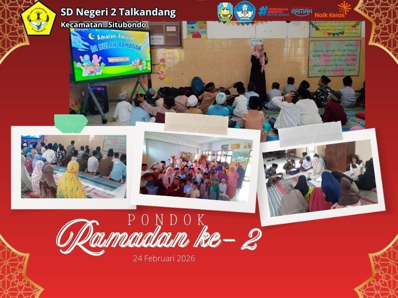 Situbondo, 24 Februari 2026 – Memasuki hari kedua rangkaian kegiatan Pondok Ramadan, Kegiatan pagi ini dibuka dengan pelaksanaan Sholat Dhuha berjamaah. Bapak Herik Maryadi, S.Pd bertindak sebagai imam sholat dhuha hari ini. Setelah pelaksanaan sholat, acara dilanjutkan dengan sesi pemaparan materi yang disampaikan oleh Ibu Qurotul Aini, S.M. yang menekankan betapa istimewanya menghidupkan malam Ramadan melalui sholat Tarawih serta keajaiban tadarus Al-Qur'an, di mana setiap huruf yang dilantunkan akan dilipatgandakan pahalanya oleh Allah SWT. Beliau juga mengajak para siswa untuk meneladani sunnah Rasulullah SAW melalui ibadah iktikaf dan pentingnya makan sahur sebagai sumber kekuatan fisik maupun batin selama berpuasa. Sebagai penutup rangkaian kegiatan hari ini, seluruh siswa melaksanakan Tadarus Al-Qur'an bersama. Kegiatan ini dibina langsung oleh masing-masing Wali Kelas, di mana siswa belajar membaca Al-Qur'an dengan benar sekaligus memupuk rasa cinta terhadap kitab suci sejak dini. Kegiatan Pondok Ramadan ini bukan sekadar rutinitas, melainkan momentum bagi siswa untuk membentuk karakter islami yang kuat dan berakhlakul karimah. Semoga dengan adanya kegiatan ini, siswa-siswi SD Negeri 2 Talkandang tidak hanya meraih nilai akademik, tetapi juga kemenangan spiritual di bulan yang penuh ampunan ini.