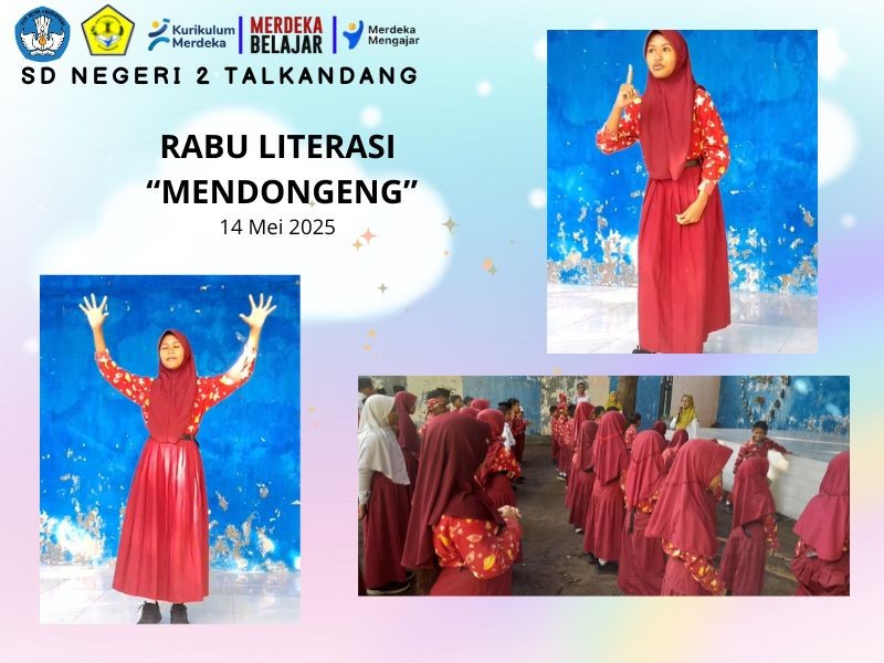 Talkandang, 14 Mei 2025 – Kegiatan Rabu Literasi kali ini giliran Ananda Jasmine Aresta Nadhifa, siswi kelas 5 SD, yang tampil membawakan dongeng di hadapan seluruh siswa dan guru. Dengan suara lantang dan ekspresi yang menarik, Jasmine berhasil menyampaikan dongeng dengan sangat baik. Cerita yang dibawakannya mampu memikat perhatian para pendengar. Terlihat seluruh siswa menyimak dongeng tersebut dengan seksama dan antusias. Kepala SD Negeri 2 Talkandang menyampaikan apresiasi kepada Jasmine atas keberaniannya tampil dan menjadi inspirasi bagi teman-temannya. Kegiatan Rabu Literasi ini merupakan bagian dari upaya sekolah untuk menumbuhkan minat baca dan kemampuan berbicara di depan umum sejak dini. Kegiatan berjalan lancar, penuh semangat, dan membawa suasana literasi yang menyenangkan di lingkungan sekolah.