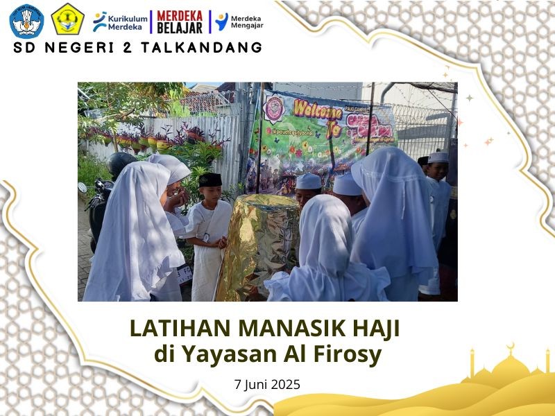 Sabtu, 7 Juni 2025, empat peserta didik SD Negeri 2 Talkandang dengan penuh semangat mengikuti kegiatan Pelatihan Manasik Haji Cilik yang diselenggarakan oleh Yayasan Al Firosy. Kegiatan ini bertujuan untuk mengenalkan rukun Islam kelima kepada anak-anak sejak usia dini melalui simulasi ibadah haji secara sederhana namun bermakna. Keempat peserta didik tersebut didampingi oleh guru pendamping, yaitu Bapak Wage Chairun Rachman, S.Pd.SD. Mereka mengikuti seluruh rangkaian kegiatan mulai dari praktik thawaf, sai, hingga wukuf di Arafah dalam suasana yang tertib dan penuh antusias. Menariknya, setelah seluruh rangkaian praktik manasik selesai dilaksanakan, para peserta mendapatkan pembagian daging kurban dari Yayasan Al Firosy sebagai bentuk kepedulian dan semangat berbagi. Kegiatan ini diharapkan dapat menanamkan nilai-nilai keislaman serta memperkuat pemahaman siswa terhadap ibadah haji dengan cara yang menyenangkan dan edukatif.