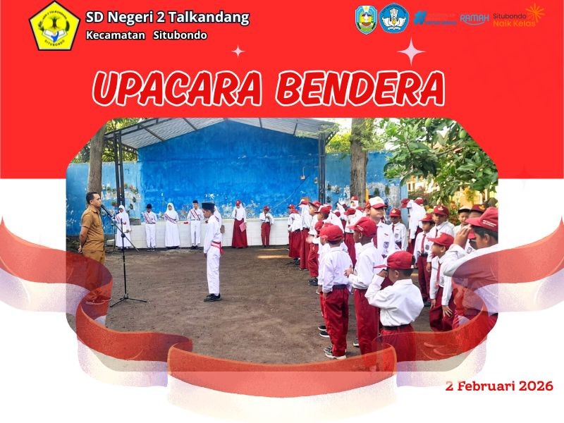 Talkandang, 2 Februari 2026. SD Negeri 2 Talkandang melaksanakan upacara bendera dengan tertib dan khidmat di halaman sekolah. Seluruh peserta didik, guru, dan tenaga kependidikan mengikuti kegiatan ini sebagai bagian dari pembinaan kedisiplinan dan karakter siswa. Senin ini pembina upacaranya adalah Bapak Abd. Syukur, S.Pd., Gr. menyampaikan amanat yang menekankan pentingnya menjaga kebersihan lingkungan sekolah. Beliau mengingatkan bahwa kebersihan merupakan tanggung jawab bersama dan menjadi cerminan sikap disiplin serta kepedulian warga sekolah. Selain itu, pembina upacara juga menyampaikan pesan kepada siswa kelas VI agar mulai mempersiapkan diri dengan sungguh-sungguh dalam menghadapi Tes Kemampuan Akademik (TKA). Sementara itu, bagi siswa kelas lainnya diingatkan untuk mempersiapkan diri menghadapi Ujian Tengah Semester (UTS) dengan belajar teratur dan menjaga kesehatan. Melalui upacara bendera ini, diharapkan seluruh siswa semakin termotivasi untuk berperilaku disiplin, menjaga kebersihan, serta siap menghadapi setiap agenda akademik yang akan datang.